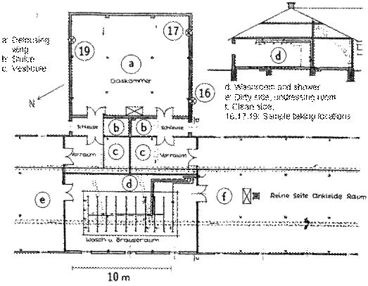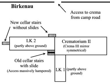 今日のダッハウ強制収容所(ミュンヘン近郊)にも見ることができるように、同じ建物群に焼却棟を設置することも普通であった。ダッハウの建物群の中では、衛生施設は衣服の殺菌駆除のためのデゲシュ社の空気循環システムをもっており、囚人シャワー室の右側と左側に脱衣室と着衣室、ならびに焼却棟を備えていた。(今日ダッハウで「ガス室」とされている部屋は、実際には、上記の図に不可欠な囚人シャワー室であり、博物館が意図的に誤った名称をつけている。)