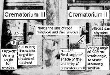 目撃証言によると、殺人ガス室はアウシュヴィッツⅠの焼却棟に存在したという。ここは今日でも現存しているが、後述するように、ごまかしの手がかなり加えられている。その他の殺人ガス室は、3キロほど離れたアウシュヴィッツⅡ、ビルケナウ収容所に存在したという。これらのガス室は、収容所の4つの焼却棟、および、殺人ガス処刑用に改造された、収容所外の2つの農家にあったという。