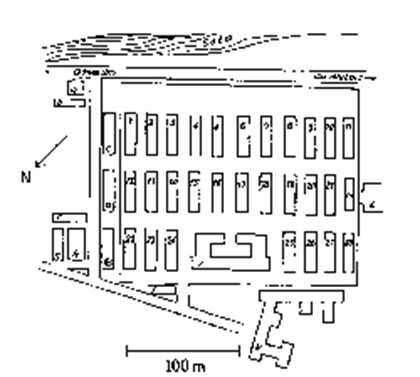 中央収容所の北西約2kmのところにあるアウシュヴィッツⅡ・ビルケナウ捕虜収容所、1944年末の状況。影のかけられている建物は現存しているが、そのうちのいくつかは廃墟となっているか、土台だけである(焼却棟Ⅱ-Ⅳ)、残りは、戦後に、ポーランド市民が建築資材として持っていってしまった。1991年のアウシュヴィッツ国立博物館の案内小冊子による。 |