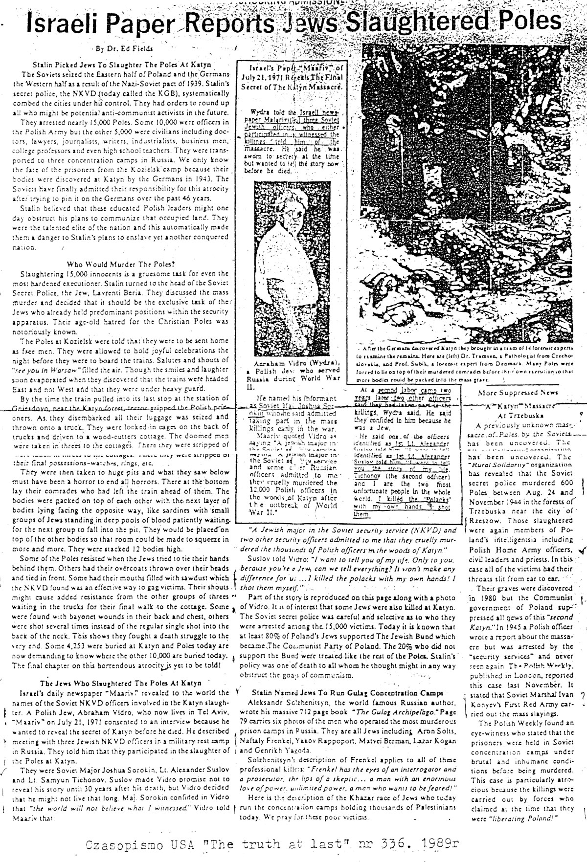 Dziennik Izraela „Maariv” ogłosił światu imiona sowieckich oficerów NKWD uczestniczących w mordzie katyńskim. Polski Żyd Abraham Vidro (Wydra), który mieszka teraz w Tel Awiwie, 21 lipca 1971 r. poprosił pismo o wywiad, bo chciałby, zanim umrze, wyjawić sekret o Katyniu. On opisał spotkanie z trzema Żydami, oficerami NKWD, w wojskowym obozie wypoczynkowym Rosji. Oni powiedzieli mu, jak uczestniczyli w mordzie Polaków w Katyniu.