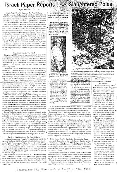 Stalin wybrał Żydów do mordowania Polaków w KatyniuZgodnie z paktem Ribbentrop-Mołotow, w 1939 r. Sowietom przypadła wschodnia część Polski, a Niemcom zachodnia. Tajna policja Stalina NKWD (dziś KGB) systematycznie ujarzmiała miasta pod jego kontrolę. Mieli rozkaz zgarniać wszystkich, którzy mogliby stanowić w przyszłości potencjalne zagrożenie dla komunizmu. Aresztowano więc około 15 tys. Polaków. 10 tys. stanowili oficerowie Wojska Polskiego, 5 tys. to cywile, wśród nich lekarze, prawnicy, dziennikarze, pisarze, przemysłowcy, biznesmeni, profesorowie uniwersytetów i nauczyciele szkół średnich. Wszyscy byli odtransportowani do trzech obozów koncentracyjnych w Rosji. My wiemy tylko o losie więźniów z obozu Kozielsk, ponieważ ich ciała zostały odkryte w Katyniu przez Niemców w 1943 r. Sowieci po 46 latach (wreszcie) przyznali się do odpowiedzialności za zbrodnię, którą zrzucili na Niemców. Stalin wierzył, że wykształceni polscy dowódcy mogą któregoś dnia unicestwić jego plany skomunizowania okupowanego kraju. Oni byli utalentowaną elitą narodu. To automatycznie czyniło ich niebezpiecznymi wobec planu Stalina podboju drugich narodów.