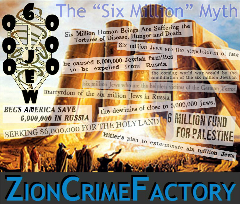 Rzeczywiście intrygujące jest pochodzenie mitycznej liczby „6 mln”. Żydzi uparcie podkreślali ją w propagandzie horroru od roku 1890 do 1945. Druga wojna światowa zakończyła się w 1945 roku, i od tego czasu ta kabalistyczna liczba zdobyła pozycję świętości, dzięki lichej i oszukańczej kampanii wielokrotnego mówienia o holo-oszustwie w wiadomościach i przemyśle rozrywkowym z ośrodkiem w żydowskim Hollywood. Jak kiedyś powiedział żydowsko-komunistyczny morderca, Władimir Lenin, „wielokrotnie powtarzane kłamstwo staje się prawdą”. Ta kampania żydowskiego oszustwa potęgowała się na przestrzeni lat. Kiedy Żydzi wyczuwają wśród gojowskiej opinii publicznej wzrost świadomości swojej zdrady i globalnych zbrodni przeciwko ludzkości (naturalna reakcja oburzenia i wrogości), tym głośniej zaczynają lamentować o wymyślonym przez siebie holokauście w kontrolowanych przez nich ośmiorniczych mediach. To dlatego zawsze mierzą puls opinii publicznej.