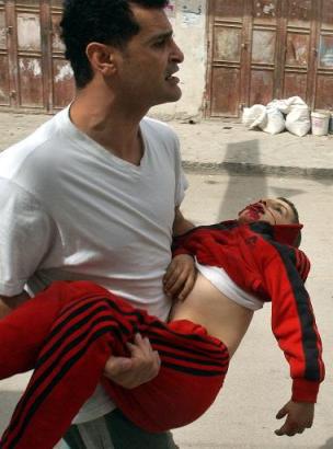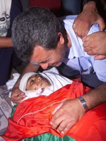 13. Nagy Abu Kamar, jedno z szóstki palestyńskich dzieci zabitych przez pociski z izraelskich śmigłowców bojowych i czołgów, które zaatakowały protestujący tłum (19 maja 2004)