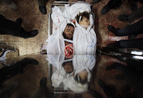 5. Ciała siedmioletniego Muhammada Akila i jego ojca, zabitych w izraelskim nalocie, szpital al-Shifa (Wissam Nassar/MaanImages)