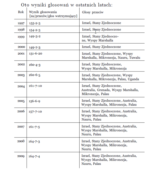 [47] Znaczny fragment tej rezolucji ulega co roku niewielkim zmianom. Cytuję tekst z 2009 r. (A/64/L.23).