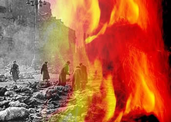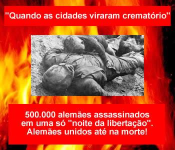 As seguintes cidades alemãs foram transformadas em crematório pelos principais criminosos de guerra Churchill e Roosevelt, cujos centros suas bombas trouxeram o dobro de calor análogo ao centro de um crematório: Kiel, Neumünster, Stralsund, Bremerhaven, Emden, Wilhelmshaven, Hamburg, Neubrandenburg, Neustrelitz, Prenzlau, Bremen, Hannover, Rheine, Osnabrück, Hildesheim, Braunschweig, Magdeburg, Berling, Potsdam, Frankfurt/Oder, Bocholt, Münster, Kleve, Wesel, Dortmund, Hamm, Soest, Krefeld, Mönchengladbach, Düsseldorf, Aachen, Düren, Bonn, Köln, Siegen, Koblenz, Trier, Bingen, Bad Kreuznach, Mainz, Worms, Kaiserslautern, Pirmasens, Karlsruhe, Pforzheim, Stuttgart, Freiburg, Friedrichshafen, Ulm, München, Augsburg, Straubing, Heilbronn, Nürnberg, Ingolstadt, Bayreuth, Mannheim, Ludwigshafen, Darmstadt, Offenbach, Hanau, Frankfurt, Gießen, Schweinfurt, Würzburg, Gießen, Kassel, Nordhausen, Merseburg, Leipzig, Chemnitz, Dresden, Eilenburg, Halberstadt, Magdeburg, Gelsenkirchen, Oberhausen, Witten, Duisburg, Hagen, Wuppertal, Solingen, Neuß, Remscheid, Brilon, Aschaffenburg.