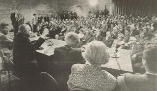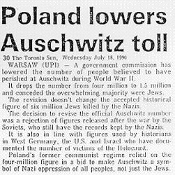 Discreta reportagem de jornal informando que uma comissão do governo polonês decidira diminuir o número de mortos em Auschwitz de 4 milhões para 1,5 milhões devido a uma superestimativa dos soviéticos ao libertar o campo em 1945