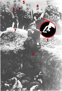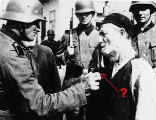 Na fotografia acima os falsificadores da história tentam mostrar soldados da SS que supostamente estariam humilhando um judeu. O SS em destaque estaria com uma faca ou uma baioneta, na verdade nem uma faca nem uma baioneta (estou aberto a sugestões). Não deixem de notar que no lugar onde deveria estar a lâmina da faca não existe nada, porém os falsificadores adulteraram parte do uniforme do soldado alemão que se encontra atrás para que se parecesse com uma lâmina, mas que é apenas o uniforme retocado com certo brilho e que ainda por cima não condiz com a posição onde se encontra o cabo da faca ou baioneta...