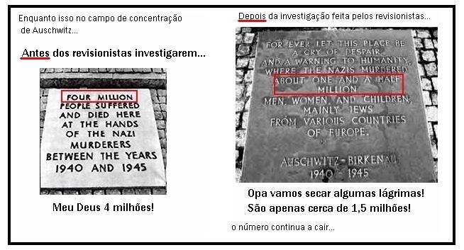 Durante décadas, foi afirmado nesta placa que quatro milhões de pessoas foram genocidamente mortas em Auschwitz. Tal como resumido pelo Dr. Faurisson, até 3 de Abril de 1990, esta Placa "comemorativa" - onde o Papa e presidentes de muitas nações foram levados de modo a poderem genoflectir perante vítimas não-existentes, tinha a seguinte inscrição em 19 línguas: