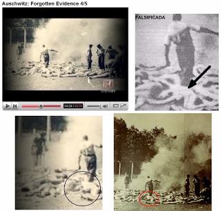 A fotografia acima foi retirada do documentário do History Channel, "Auscwhtiz: Evidências Esquecidas" que está disponível no youtube.com. Ironicamente, para não dizer infelizmente, o documentário tenta provar a veracidade do Holocausto usando fotografias sabidamente falsificadas.