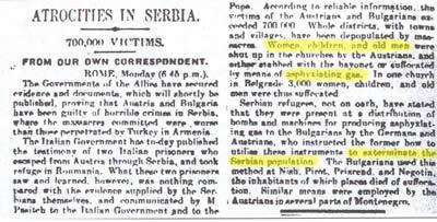 Crianças, mulheres e idosos foram confinados pelos austríacos nas igrejas e perfurados por baionetas ou mortos pela ação de gás asfixiante. Em uma igreja de Belgrado, foram encontradas asfixiadas desta forma 3.000 mulheres, crianças, idosos.[...]”