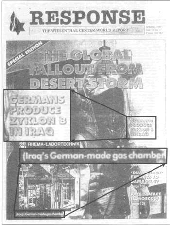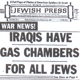 Se você, caro leitor, achar que isso seja notório, sinto em decepcioná-lo. Vejamos dois exemplos recentes, do ano de 1991, ou seja, quase 50 anos após o início da segunda propaganda holocáustica. Trata-se da primeira guerra do Golfo, onde os americanos tinham como objetivo expulsar os invasores iraquianos do Kuwait. A Jewish Press, de Nova Iorque, que se auto-intitula “o maior jornal semanal anglo-judaico”, escreveu em sua manchete de 21 de fevereiro de 1991: