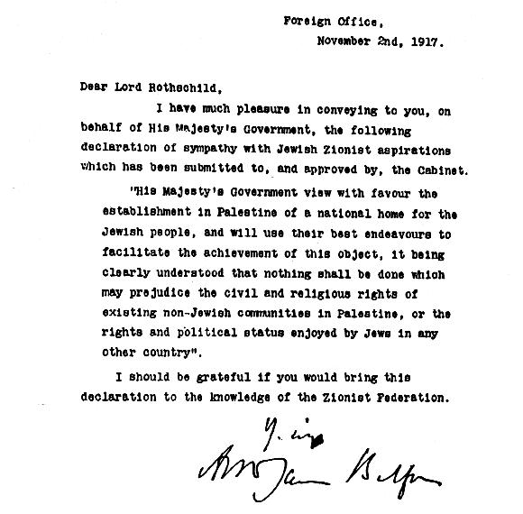 "O Governo de Sua Majestade vê com simpatia o estabelecimento na Palestina de um lar nacional para o povo judeu e envidará seus melhores esforços para facilitar a conquista desse objetivos, ficando claramente entendido que nada será feito que possa prejudicar os direitos religiosos e civis das comunidades não judaicas existentes na Palestina ou os direitos e condições políticas usufruídas pelos judeus em qualquer outro país."Agradeceria que o senhor levasse essa declaração ao conhecimento da Federação Sionista.