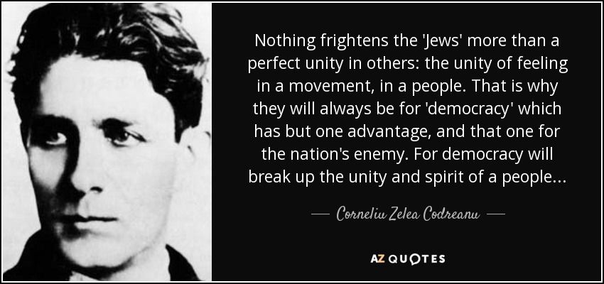 Democrația la care suntem supuși se trădează prin dinamica ei a fi un organism de sinteză subordonat capitalismului, știind că acesta se află în mâna jidanilor, iar aceștia ne urăsc pentru tot ceea ce înseamnă ființa noastră, bănuiesc că nu duce la complot dacă înțelegem că forma de guvernare la care suntem constrânși o să ne poarte inevitabil spre cimitirul civilizațiilor… la gunoiul istoriei!Și, totuși, ce putem face, ce anume ne menține în starea de anomie, cum se face că, deși simțim declinul nostru, conștientizăm că „revoluția“ din ’89 a servit la colonizarea economiei românești, la amanetarea poporului, la delapidarea bogățiilor, la anihilarea viitorului… cum se face că nu mai avem capacitatea de „trezire“, cum se face că nu ripostăm?!