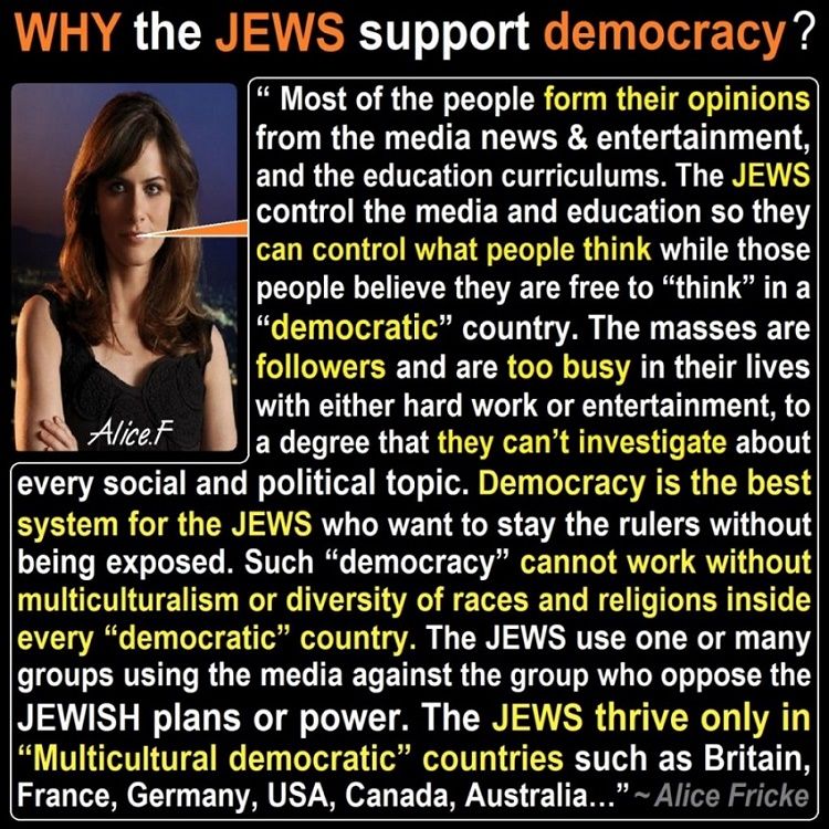 Democrația occidentală, parazitată și ea până în măduva oaselor, capătă formele unui gigantic spital psihiatric, în care pacienții sunt tratați cu iluziile unui sistem care, fără propagandă continuă, fără spălarea creierelor din școala elementară, fără mass media, fără iudeologi omniprezenți și fără represiune iudeologică, fără falsificarea trecutului, rescrierea istoriei și, în cele din urmă, șantajul financiar nu ar reuși să supraviețuiască și să-și impună dominația nici măcar asupra unui trib arhaic din jungla amazoniană.