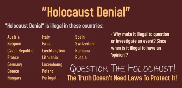 – John Weir, Holocaustul ca mit: trădarea încrederii publice„Dacă Holocaustul ar fi lipsit de importanță, nu am avea în jur de 20 de țări pe această planetă care ar interzice ancheta critică. De fapt, acesta este singurul subiect istoric reglementat de legea penală. Aceasta este o dovadă a faptului că puterile consideră că acest subiect este cea mai importantă problemă de păstrat sub controlul lor strict. Acei puteri de cenzurare, de suprimare sunt adevărații criminali – nu disidenții istorici pe care îi trimit la închisoare.”