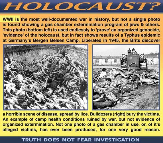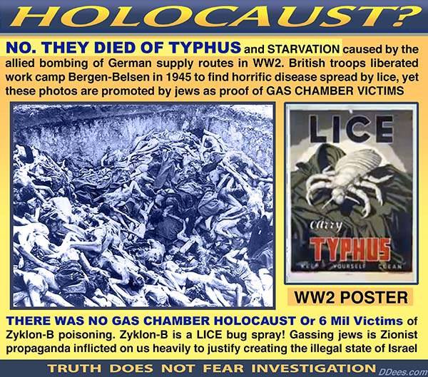 Toate fotografiile cu grămezi de cadavre care muriseră de tifos și / sau subnutriție au fost făcute în taberele occidentale în jurul sfârșitului războiului, cum ar fi Dachau, Bergen-Belsen și Buchenwald, unde istoricii sunt de acord acum că nu au avut loc crime în masă. În mod semnificativ, nu există astfel de fotografii făcute în lagărele în care se presupune că a avut loc crimă în masă (Auschwitz, Treblinka, Belzec, Sobibor, Chelmno, Majdanek.) Aceste lagăre din est se aflau în zone care au intrat sub control sovietic la sfârșitul războiului. Este foarte grăitor că sovieticii nu au publicat nicio fotografie cu morminte comune sau grămezi de cadavre și nu au permis niciunui jurnaliști, profesioniști din domeniul medical sau alți experți să examineze lagărele.Igiena personală scăzută a evreilor din ghetourile poloneze a exacerbat răspândirea tifosului. Mulți duceau păduchi și nu se spălau. Acesta este motivul pentru care părul lor a fost ras și au fost forțați să facă duș și hainele lor fumigate cu insecticidul Zyklon-B – pentru a preveni răspândirea tifosului de către păduchi.