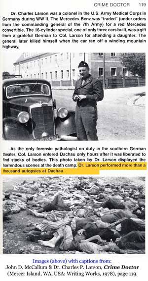 Printre aceștia s-a numărat doctorul Charles Larson, unul dintre principalii patologi medico-legali din America, ca parte a unei echipe americane de investigare a crimelor de război. Dr. Larson a efectuat autopsii la Dachau și în alte douăzeci de tabere germane, examinând în câteva zile peste 100 de cadavre. După munca sumbră de la Dachau, a fost interogat timp de trei zile de procurorii armatei SUA.