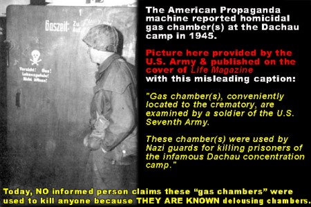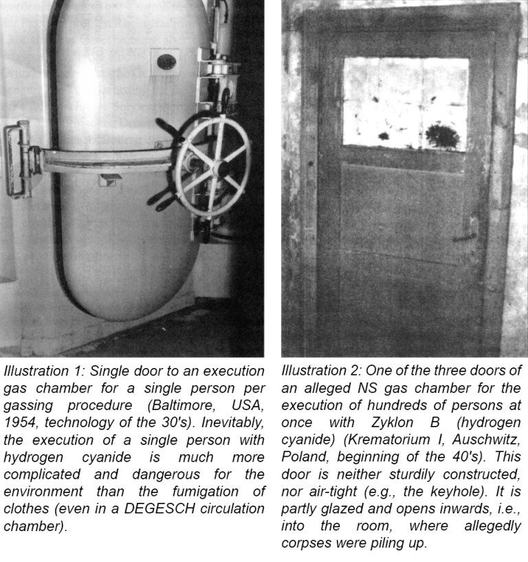 Nu numai că acele camere de dezinfectare erau prea mici pentru povestea imaginată a camerelor de gaz ale Holocaustului, dar aparatele lor delicate ar fi fost ușor spulberate de oameni disperați, care mureau. Deci, cum arată „ele”, întrebi. Este ușor de răspuns: nu au existat niciodată, sunt un coșmar-halucinație cu același statut ca și sabatele satanice ale vrăjitoarelor, folosite pentru a condamna vrăjitoarele cu secole mai devreme. Dar pentru a descrie camerele de gaz germane actuale: