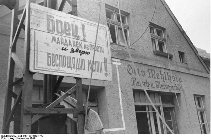 Pe pancarta de deasupra, pe care autoritățile sovietice au ridicat-o pentru a se adresa soldaților lor și care a fost descoperită de germani în timpul unei contraofensive, se putea citi: „Soldați! Majdanek nu iartă. Răzbunați-vă fără milă!” Mai mult, în timpul acelei contraofensive, germanii au găsit cadavrele a numeroși civili care au fost masacrați, inclusiv cele ale unor copii complet nevinovați. AU plătit pentru Majdanek.La sfârșitul lunii august 1944, propaganda a devenit internațională. Lansarea a venit odată cu publicarea unui raport lung al unei „Comisii extraordinare polono-sovietice” care a investigat la Majdanek. Autorii au afirmat că „Ceea ce a fost găsit de Comisie lasă cu mult în urmă, în brutalitatea și barbaria sa, crimele monstruoase comise de invadatorii germano-fasciști deja cunoscuți opiniei publice mondiale.”