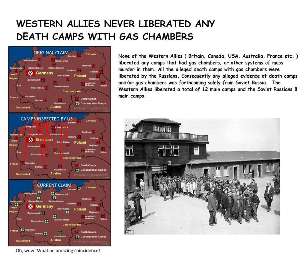 Niciunul dintre aliații occidental (Marea Britanie, Canada, SUA, Australia, Franța etc.) nu a eliberat tabere/lagăre de muncă care aveau camere de gazare sau alte sisteme de crimă în masă. Toate presupusele lagăre ale morții cu camere de gazare au fost eliberate de sovietici! În consecință, orice dovadă presupusă a lagărelor morții și/sau a camerelor de gazare a fost prezentată exclusiv de bolșevicii sovietici (URSS). Aliații occidentali au eliberat un total de 12 tabere principale, iar sovieticii 8 tabere principale.Tabere de exterminare – propagandă sovietică rămasă