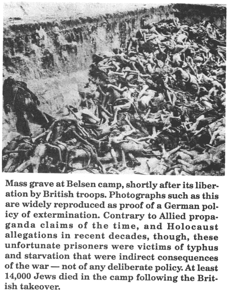 Întreaga lume a văzut probabil filmul eliberării lagărului de concentrare Belsen, este oribil să spunem cel puțin. Schelete umane se plimbau cu trupurile moarte, acestea acoperind solul. Filmul a fost prezentat în întreaga lume la acea vreme pentru a arăta răul Germaniei naziste. Cu toate acestea, Belsen a fost eliberat de aliații occidentali și nu s-a pretins că ar fi avut nici o cameră de gazare sau că ar fi făcut parte dintr-un program sistematic de crimă în masă. Victimeleau murit, de fapt, de tifos, confirmat de dosarele medicale germane, de Crucea Roșie și sursele militare britanice – acest lucru nu este niciodată indicat ori de câte ori este prezentat acest film. În mod ironic, decesele s-au datorat în mare parte lipsei de Zyklon-B pentru dezinfectarea hainelor, la sfârșitul războiului, cu Germania prăbușindu-se, ducând la un focar de tifos în masă în lagărele de concentrare.