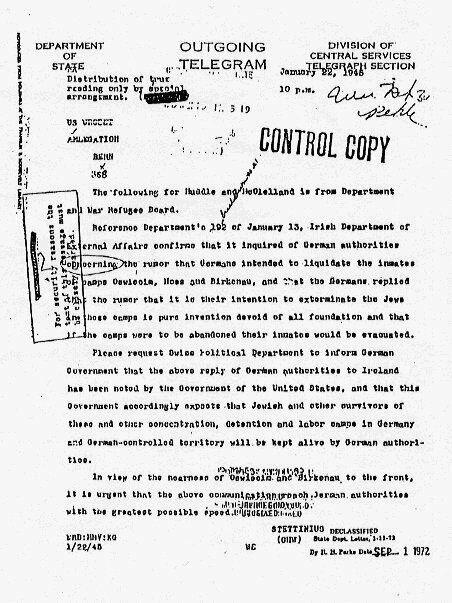 - Oficialii guvernamentali de rang înalt ai SUA și ai Germaniei au discutat între ei prin consulii elvețieni și irlandezi în 1944 și ’45 despre starea deținuților din lagărele operate de germani.