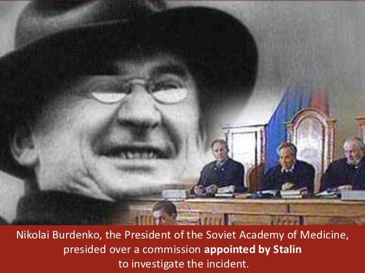 Raportul sovietic care i-a învinuit pe germani pentru comiterea masacrului Katyń a fost listat la Nürnberg ca 054-URSS. Evident, acest raport este un pachet complet de minciuni, fabricat de un pachet de mincinoși cu o agendă. Doi dintre mincinoșii care au semnat acest raport au fost:„Membru al Comisiei speciale de stat, Academic NN Burdenko”