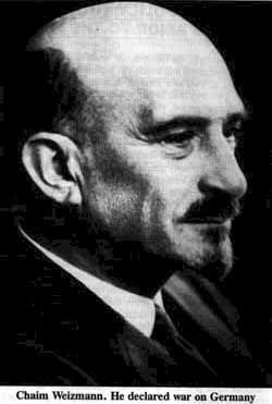 5 сентября 1939 г. Хайм Вейцман (Chaim Weizmann), один из сионистских лидеров, объявил Германии войну от имени евреев всего мира, заявляя, что евреи будут бороться в поддерж-ку Великобритании и что Еврейское Агентство готово принять немедлен-ные меры по использованию еврейских людских ресурсов, а также других действий. А до этого, начиная с 1933 г., различные еврейские организации и агентства шесть раз(!) объявляли миру, что они находятся в состоянии войны с Германией.