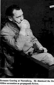 Ганс Фрицше, самый главный чиновник в Министерстве Геббельса, бывший одним из обвиняемых на Нюрнбергском процессе, пишет, что Геринг, даже после ознакомления с показаниями Олендорфа о деятельности групп СД и с показаниями Коменданта "Освенцима" Хесса, был убежден, что история об организованном уничтожении евреев была фикцией ("The Sword in the Scales" /"Меч на весах юстиции"/, London, 1953, стр. 145). На суде Геринг заявил, что первый раз, где он слышал о геноциде евреев было на Нюрнбергском процессе, (Ширер, стр. 1147). Еврейские писатели Поляков, Райтлингер, Манвелл, Франкль, все утверждают, что Геринг принимал непосредственное участие в разработке и претворению в жизнь плана по уничтожению евреев, но Чарльз Бьюли (Charles Bewley) в своей книге "Нermann Goring" (Gottlingen, 1956 г.) показывает, что не было предоставлено никаких доказательств в поддержку этого обвинения.