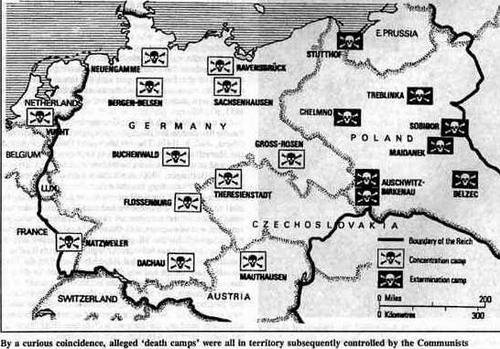 Концлагерь "Освенцим" возле Кракова в Польше является местом, где якобы были убиты миллионы евреев. Сразу после войны утверждалось, что в лагерях "Дахау" и "Берген-Бельзен" тоже проводились массовые убийства в "газовых камерах", но вскоре стало очевидным, что там не было "газовых камер". Тогда история о геноциде была сдвинута на Восток, в лагеря на территории Польши, особенно "Освенцим". Но т.к. те лагеря находились в советской зоне оккупации, то никто не мог воочию убедиться насколько состоятельны были эти утверждения. В течение 11 лет после окончания войны советские не разрешали никому посещать "Освенцим", в это время они проводили работы по изменению облика лагеря, чтобы придать ему вид соответствующий легенде о миллионах там уничтоженных. Они даже построили дымовую трубу, которая не вела ни к какой печи!