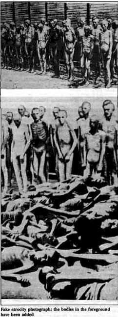 Трагические ситуации типа той, что имела место в "Бельзене" были не только беззастенчиво использованы в целях пропаганды, но были также сделаны фальшивые фотографии и фильмы. В большинстве лагерей удалось избежать условий, подобных тем, что привели к массовым смертям в "Бельзене" и их заключенные вышли оттуда в хорошем состоянии здоровья. Но этих фотографий вы не увидите в книгах и фильмах о «шести миллионах», зато там полно подделок.