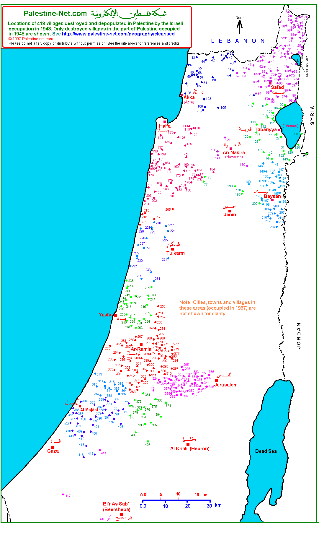 "Aldeas judías han sido construídas en lugar de aldeas Arabes Palestinas. Ustedes ni siquiera saben el nombre de estas aldeas Arabes, y no los culpo ya que los libros de Geografía no existen ya, no nada mas ya no existen los libros sino que las aldeas Arabes tampoco. Nahlal se erigió en lugar de Mahlul; Kibbutz Gvat, en lugar de Jibta; Kibbutz Sarid, en lugar de Huneifis; y Kefar Yehushua en lugar de Tal al-Shuman. No existe un sólo lugar construído en el país, en el que no haya existido población Arabe con anterioridad."
