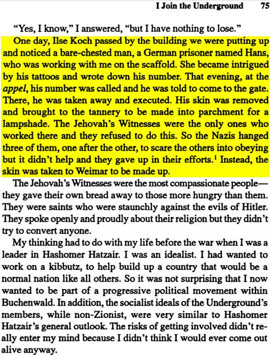 Su piel fue quitada y llevada a la curtiduría para ser "laminada" (parchment) para la cubierta de piel (lampshade) [de la lámpara]. Los Testigos de Jehová eran los únicos que trabajaron allí y ellos rechazaron hacer esto. Entonces los Nazis ahorcaron a tres de ellos, uno tras otro, asustaron a los demás en para que obedecieran pero esto no ayudó y ellos se rindieron en sus esfuerzos. En cambio, la piel fue llevada a Weimar para ser elaborada...