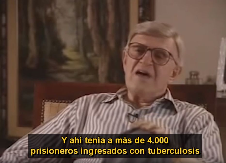 minuto 57:30 ex prisionero judío, médico, describe a prisioneros ingresados en el hospital del campamento, enfermos de tuberculosis en los días finales de la guerra, quién no intentaría curar a un prisionero para luego gasearlo?