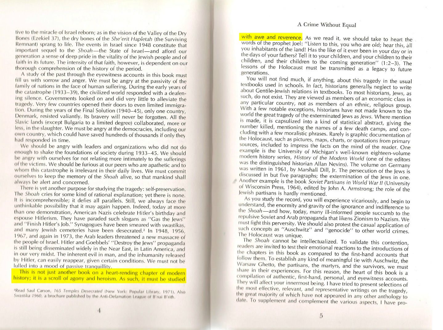 En la introducción a su libro publicado en 1982, Witness to the Holocaust, una colección de unos 100 'testigos oculares', Eisenberg escribe: