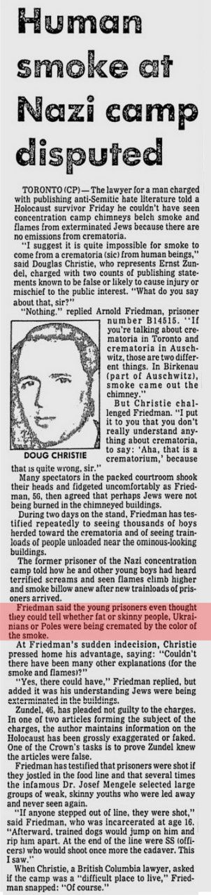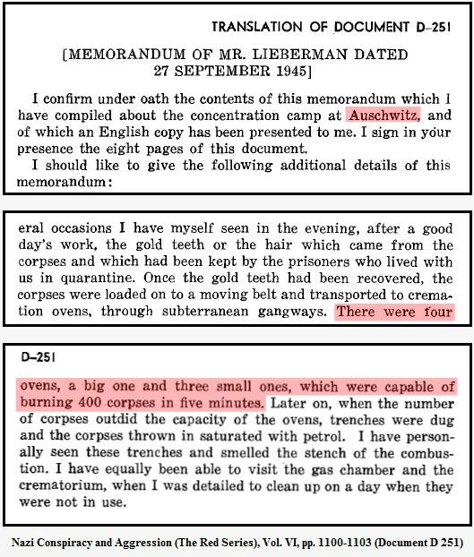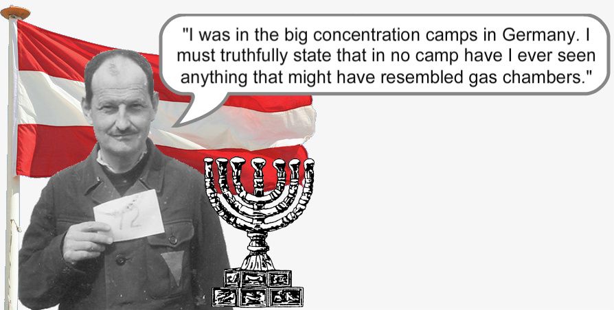 “Yo estuve en los grandes campos de concentración de Alemania. Pero, conforme a la verdad, tengo que estipular que NO HE ENCONTRADO JAMÁS en ningún campo NINGUNA INSTALACIÓN COMO CÁMARA DE GASEAMIENTO." - Doctor JUDÍO Benedikt Kautsky, estuvo preso durante 7 años, 3 de ellos en Auschwitz, declaración hecha en su libro Teufel und Verdammte, publicado en Suiza en 1946.