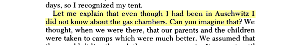 "Dejame explicarte que aunque estuve en Auschwitz no tenía conocimiento sobre las cámaras de gas. Puedes imaginarte eso?" - Marika Frank Abrams - fuente