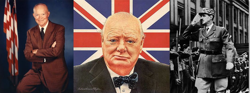 De izquierda a derecha: Dwight D. Eisenhower, Winston Churchill y Chales de Gaulle.