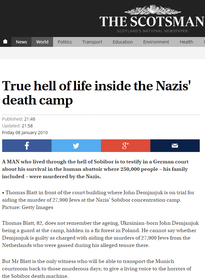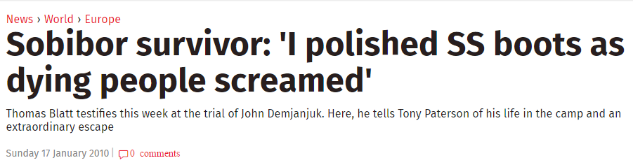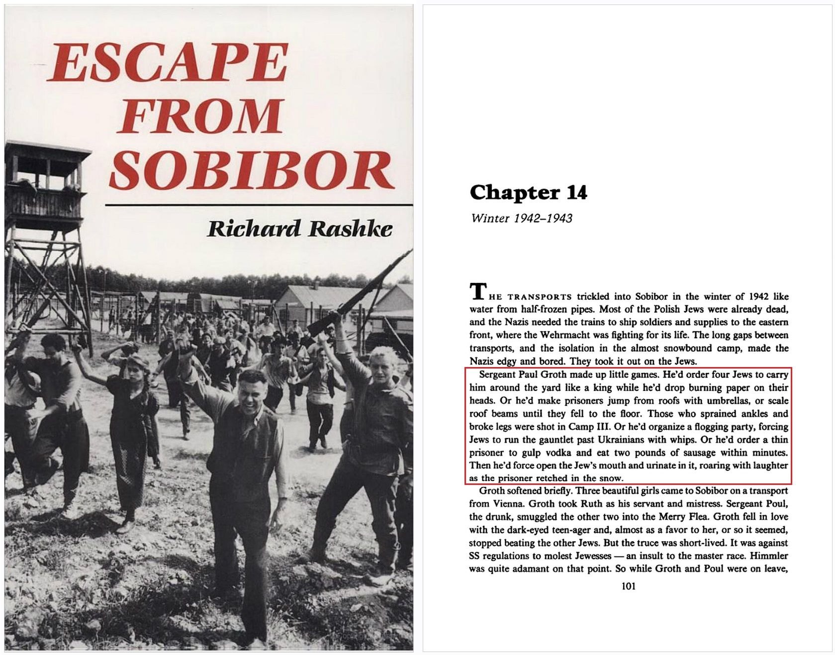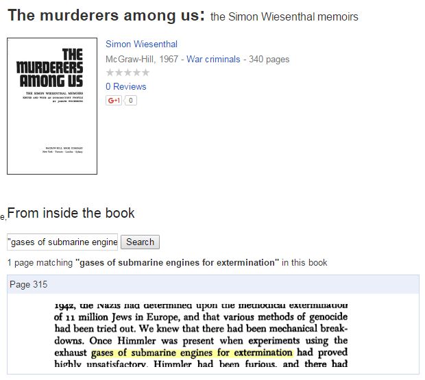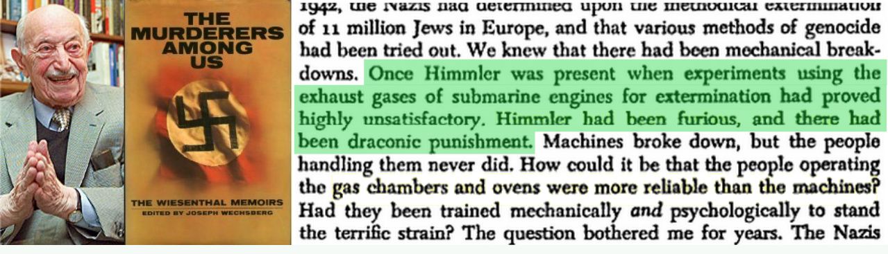 “Los nazis mataron a judíos en el campo de exterminación de Sobibor, Polonia con los gases expulsados por el motor de un submarino soviético capturado. Los alemanes, reconocidos por su eficacia, usaron un motor sin piezas de recambio, sin instrucciones en alemán, pesando varias toneladas, llevado a Sobibor desde dios sabe donde.”