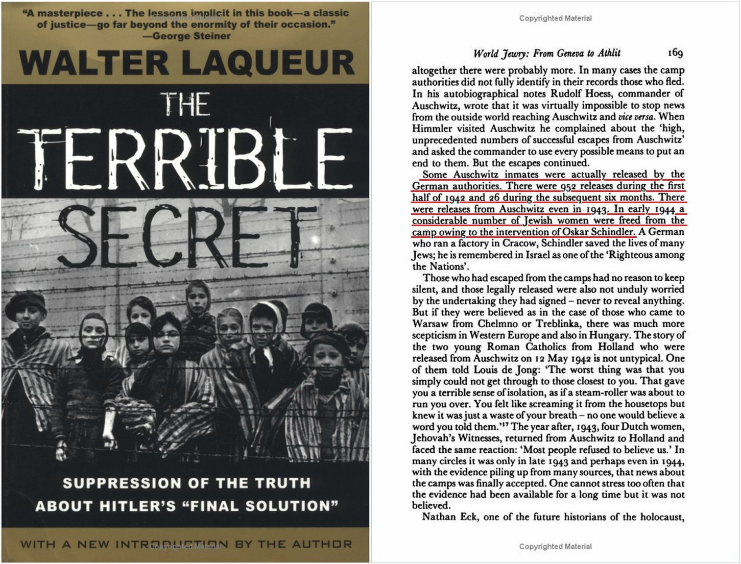 "Algunos reclusos de Auschwitz fueron sorprendentemente liberados por las autoridades alemanas. Hubo 952 liberaciones durante la primera mitad de 1942 y 26 durante los meses siguientes. Hubo liberaciones de Auschwitz incluso en 1943. A principios de 1944 un número considerable de mujeres judías fue liberado del campo debido a la intervención de Oskar Schindler."