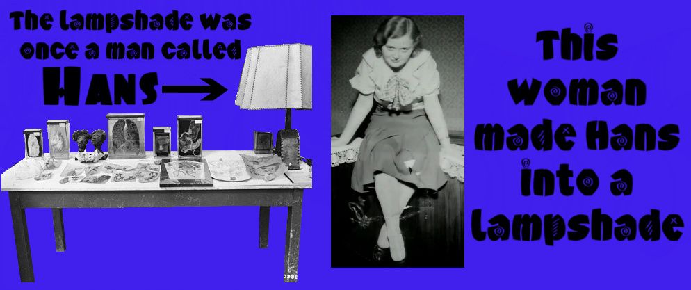 Debajo de la pantalla había un soporte hecho de pedazos de hueso humano y, como un artículo decorativo, un cráneo humano encogido. El material parecido a un pergamino se parecia a un rollo de la Torá. Usted podría ver los agujeros diminutos donde estuvo una vez el pelo... Hasta este día, siempre que pienso en ello, cierro mis ojos y la pantalla con los tatuajes de Hans está justo allí. Esto es una visión horrorosa que siempre permaneció conmigo."