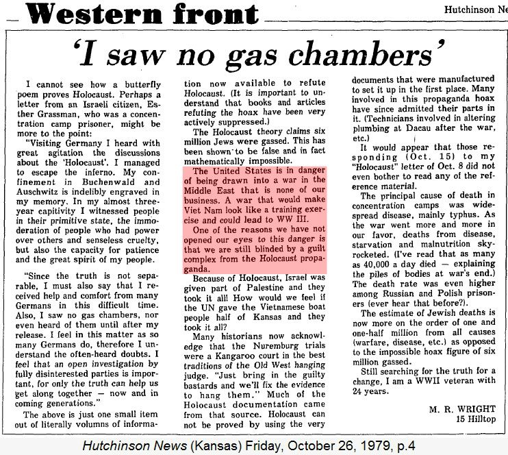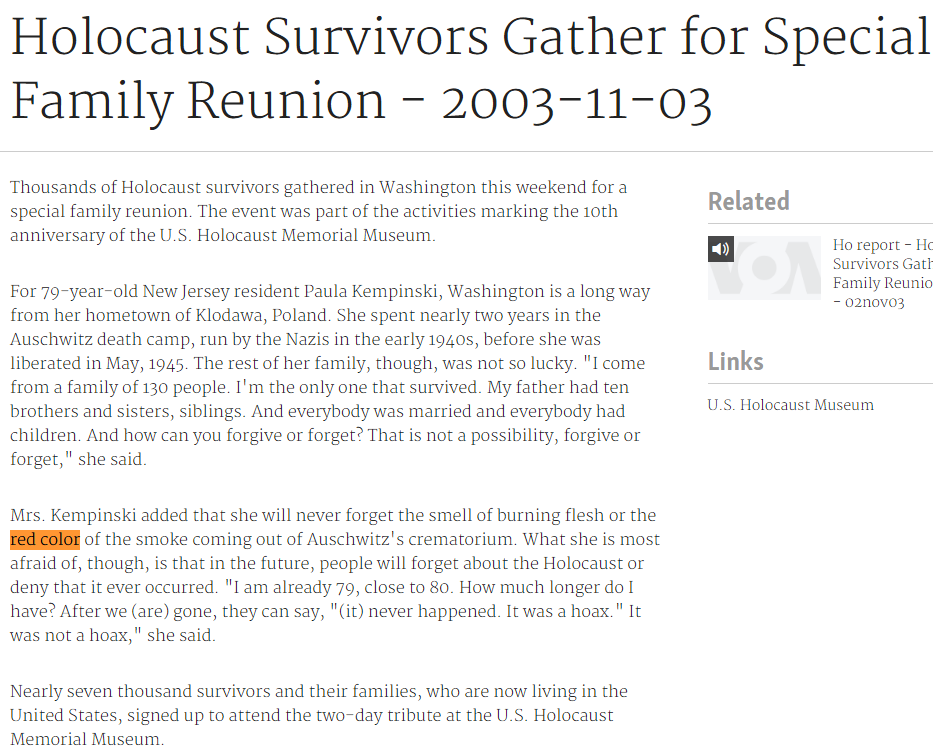 M. R. Wright en este artículo publicado en 1979 cita a Esther Grassman, una judía israelí y superviviente de Auschwitz y Buchenwald, quien admitió que ella nunca vio, ni siquiera oyó sobre las cámaras de gas hasta que fue liberada.