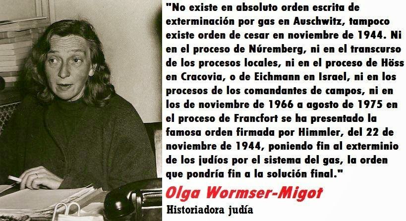 "No existe en absoluto orden escrita de exterminación por gas en Auschwitz, tampoco existe orden de cesar en noviembre de 1944. Ni en el proceso de Núremberg, ni en el transcurso de los procesos locales, ni en el proceso de Höss en Cracovia, o de Eichmann en Israel, ni en los procesos de los comandantes de campos, ni en los de noviembre de 1966 (a agosto de 1975) en el proceso de Francfort se ha presentado la famosa orden firmada por Himmler, del 22 de noviembre de 1944, poniendo fin al exterminio de los judíos por el sistema del gas, la orden que pondría fin a la solución final" -Olga Wormser-Migot, historiadora JUDÍA, 1968.