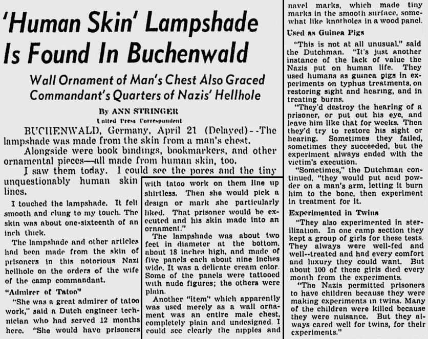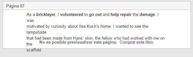 ... Como albañil, me ofrecí para salir y ayudar a reparar el daño. Fui motivado por la curiosidad sobre el hogar de Ilse Koch. Quise ver la pantalla que había sido hecha de la piel de Hans, el muchacho que había trabajado conmigo sobre el andamio. Bien, conseguí verlo con mis propios ojos. Era aún más espantoso mirar ya que yo conocía al hombre a quien perteneció [la piel] cuando él estaba vivo."