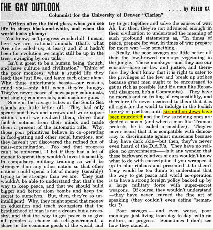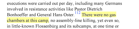 "En esta masa de escritura, que forma un total de 7.061 páginas (no incluyendo las partes introductorias), publicado a partir de 1948 hasta 1959, uno no encontrará ninguna mención de las 'cámaras de gas' nazis, 'un genocidio' de los judíos, 'o de seis millones' víctimas de la guerra."