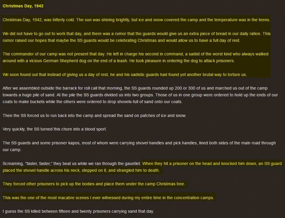 En su libro, él afirma que el día de navidad en 1942, los nazis pusieron cadáveres bajo el árbol de Navidad de Auschwitz-Birkenau.