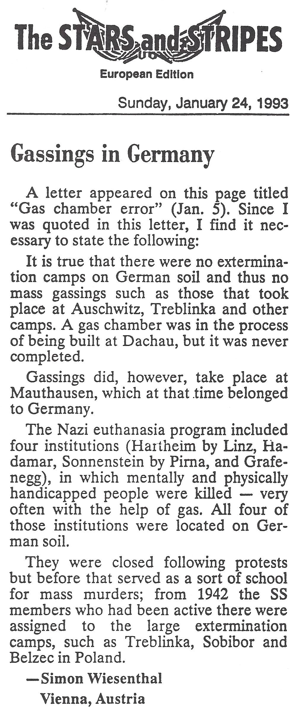 En una carta publicada en la edición de enero de las barras y estrellas, un periódico por el personal de servicio militar de los Estados Unidos, Simon Wiesenthal volvió a confirmar, de paso, que "no había campos de exterminio en suelo alemán" durante el Segunda Guerra Mundial. Él hizo la declaración idéntica en una carta publicada en la edición de abril de 1975 del British periódicas Libros y bookmen.