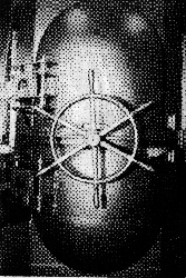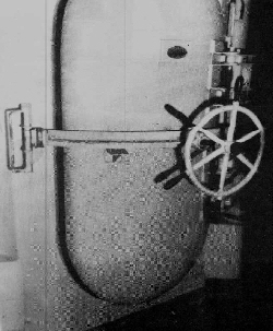 Observera den kraftiga stålkonstruktionen och den ordentliga skruvdörren. Då HCN är en livsfarlig gas, inte bara för den som ska gasas, utan även för de som medverkar under avrättningen, är tätningen vital för att inte gasen ska spridas och döda även de vakter som övervakar avrättningen.