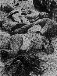 44 - De bilder som visas i medierna och i filmer utgör inte de bevis på att "förintelsen" ägt rum?Förintelsepropagandister använder sig oftast av autentiska bilder som förses med propagandistiskt konstruerade passande bildtexter. Likhögar (med döda tyska kvinnor och barn från terrorbombningarna av Dresden, Hamburg och Berlin) har presenterats som mördade judar. De högar med utmärglade lik som ofta visas, dog av epidemier och härstammar från läger i Tyskland (Bergen-Belsen), där det är idag allmänt känt att det inte fanns några gaskammare. I krigets kaotiska slutskede ledde de allierades massbombningar, av kommunikationsnäten, till att försörjnings- linjerna till koncentrationslägren bröt samman. De utmärglade kropparna är från de människor som föll offer för svält och sjukdomar, vilka p g a brist på bl a Cyklon B, spreds fritt bland de internerade.